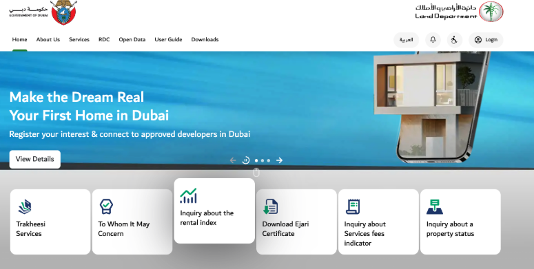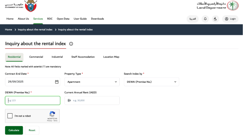- Go to the website of the Dubai Land Department and open the Rental Index Calculator. You will be directed to a dashboard as shown below